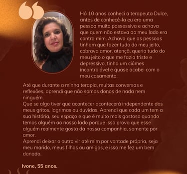 .....Passei por um dos momentos mais difíceis da minha vida — um período em que tudo parecia sem sentido, não entendia o porque tudo aquilo estava acontecendo, como fui parar no fundo do poço. Perdida, emocionalmente exausta e sem saber como recomeçar. Foi nesse momento que encontrei ajuda na terapia junto a Dulce, e posso dizer com toda certeza: sua ajuda foi absolutamente transformadora. Com acolhimento, escuta genuína e uma sensibilidade que me tocou profundamente, ela me guiou passo a passo para uma vida incrível. Cada sessão foi uma luz, uma descoberta, uma reconstrução. Aos poucos, fui me reencontrando, resgatando minha força, minha alegria, minha essência.