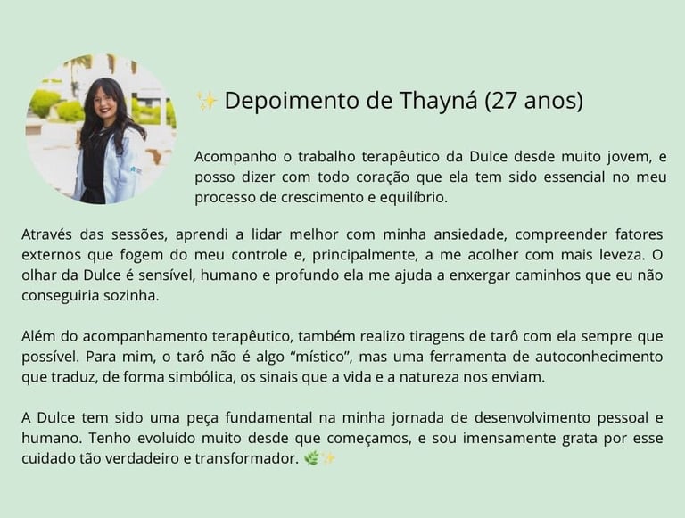 .....Eu sou extremamente grata pela Dulce tanto pelo lado profissional como pessoal, pois ela sempre me deu suporte em momentos de necessidade, oferecendo ajuda e apoio, e foi fundamental para minha melhoria. Uma profissional que serve conforto e dedicação em tudo que ela faz. Tanto a terapia quanto o tarô, me trouxeram clareza e autoconhecimento, e a cada conversa, conseguia enxergar com mais profundidade minha escolhas, sentimentos e caminhos possíveis a seguir. Ela me ajudou a confiar mais na minha intuição e a entender situações que antes pareciam confusas, me dando uma direção melhor na vida. Hoje me sinto mais conectada comigo mesma. Passei a buscar mais conhecimentos e assim pude destravar grande parte dos meus medos e hoje consigo lidar com os desafios de forma mais leve. Só tenho a agradecer por essa pessoa e profissional incrível que ela é. E eu recomendo demais, para quem, assim como eu, busca uma evolução e direção na vida!!